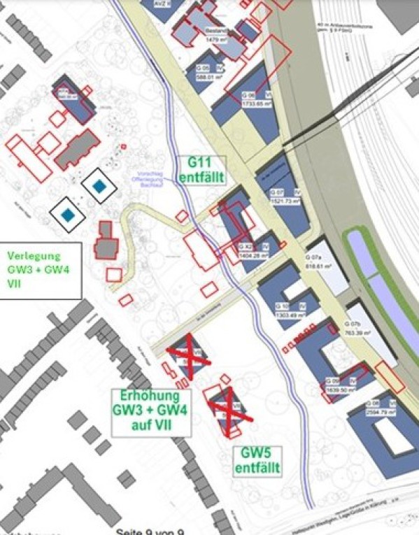 siebengeschossige (statt bisher drei viergeschossige !!!) Baukörper an der Straße „Auf dem Hügel“ errichtet werden, der alternative dritte Baukörper (GW5) soll entfallen.